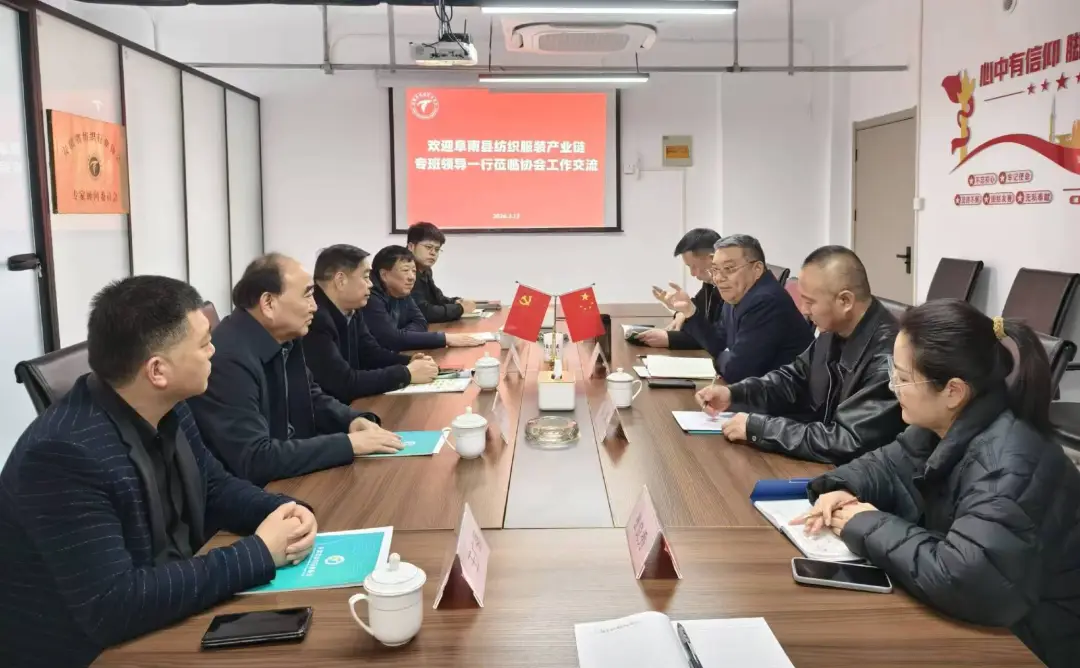 3月13日,阜南县纺织服装产业链专班一行莅临安徽省纺织行业协会交流座谈。专班由阜南县委组织部副部长、县人社局党组书记、局长薛磊带队,成员包括县委组织部部务会成员、四级调研员刘刚,县委统战部副部长、工商联党组书记、常务副主席赵四海,县工商联办公室主任代莽等,执行会长叶梁、合肥市阜南商会会长刘其洲、协会副会长孟磊、副秘书长崔良秀等热情接待并参与座谈,双方围绕产业发展、协会建设、合作共赢等核心议题展开深入交流。